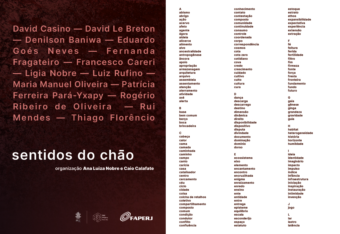 O ciclo de encontros “Sentidos do chão”, realizado online entre 6 e 28 de maio de 2021, nasceu do desejo de aprender com o chão, considerando a multiplicidade de sentidos que assume e as infinitas possibilidades enraizadas nas suas dobras semânticas com solo/terra/ piso – termos tão implicados um no outro que, em várias línguas, uma só palavra aponta ao mesmo tempo para o chão e o planeta em que vivemos. Alinhado com várias outras iniciativas e estudos recentes, o ciclo buscou atentar para o chão como quem atenta para este corpo planetário que age, reage, vive, morre e guarda memória; matéria heterogênea com propriedades que podem ser afetadas, modeladas e transformadas pela ação antrópica e não-antrópica.