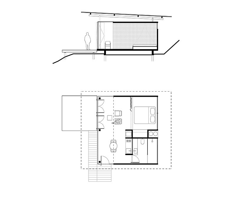 o “abrigo alto” faz parte de um conjunto de 3 edificações projetadas pelo grua para um sítio no vale das videiras, região serrana do rio de janeiro: “pavilhão” (primeiro a ser construído, em 2016), “abrigo alto” a “abrigo baixo” projetados em 2019 e finalizados em 2022. cada um, com 30m2 de área interna, tem espaço reservado para dormir - fechado por uma leve cortina -, uma sala ligada a um deck frontal, uma pequena copa e um banheiro completo.