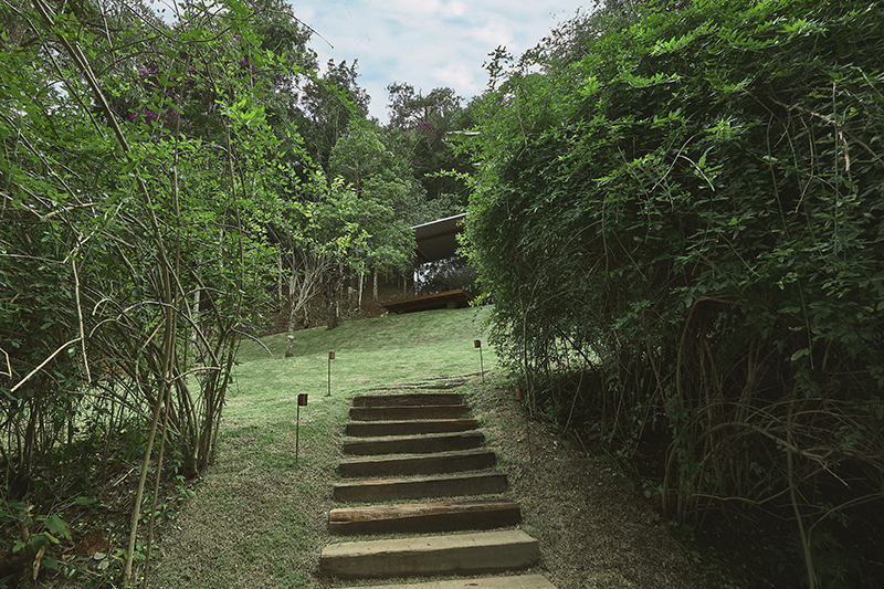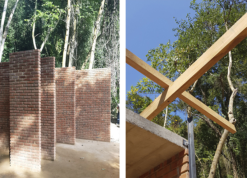 os abrigos do vale seguem o mesmo sistema construtivo e módulos espaciais: vãos de 3m e 5m com apoios que variam de pilares em madeira a muros de alvenaria cerâmica. o vigamento de madeira maciça sustenta a cobertura em painéis de telha trapezoidal termo acústica, que se debruçam formando beirais de até 1,80m. nos ambientes mais controlados (quarto e banheiros) uma fina laje em concreto armado funciona como forro, criando uma dupla camada de isolamento em relação ao exterior.