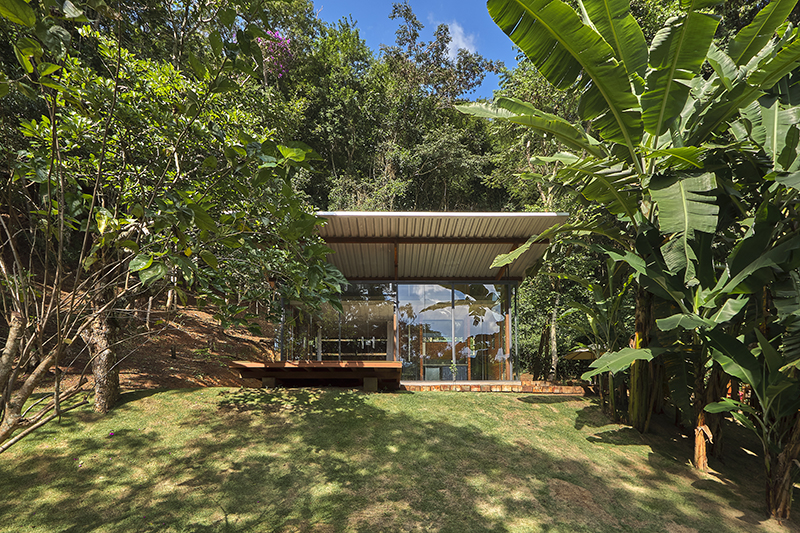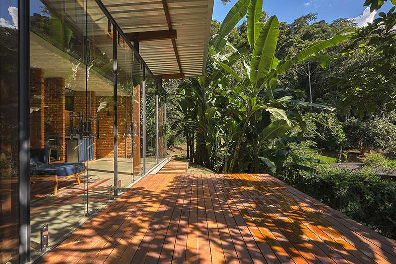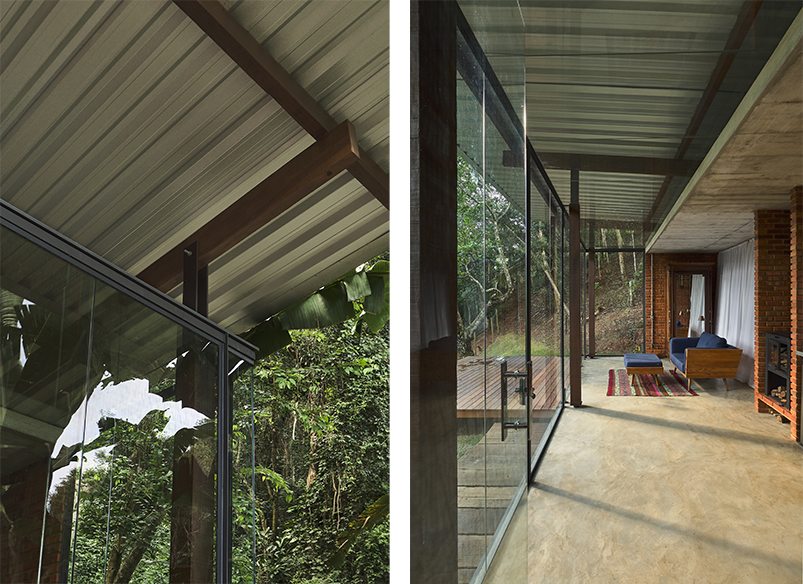 no trecho que se debruça sobre a vista do vale, o “abrigo alto” tem como fechamento um pano de vidro em toda sua extensão, que, somado ao fechamento superior, conforma uma caixa translúcida.