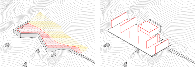 um muro de geometria irregular erguido a partir da realocação de pedras encontradas no terreno sustenta os planos leves da laje em concreto moldado “in loco”, das paredes em tijolos maciços, da fachada em vidro.