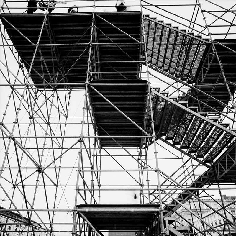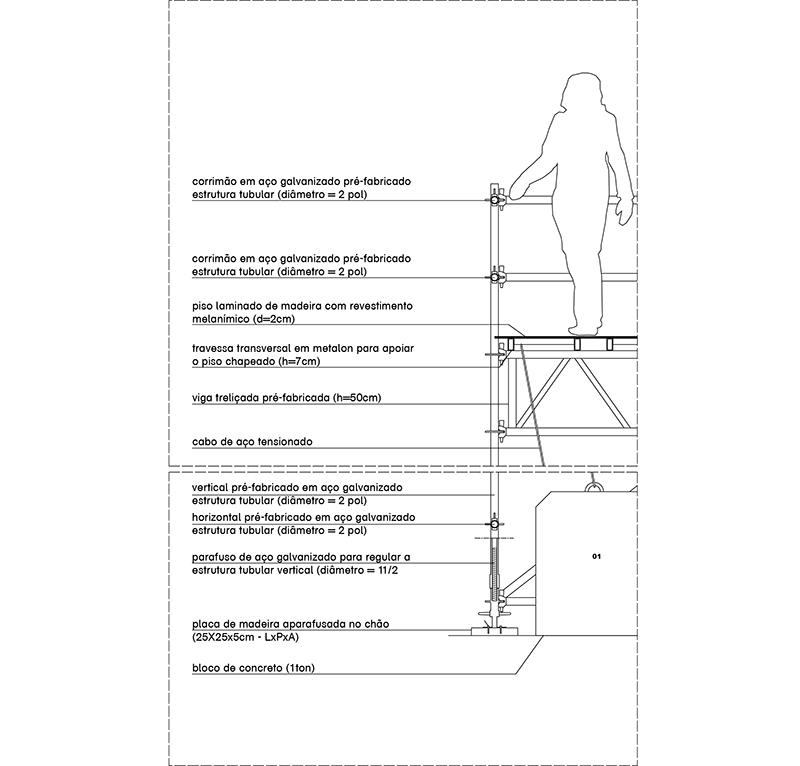 uma escada em estrutura tubular conduz o público até uma plataforma que se eleva a 10 metros do nível do solo, mesma altura da extinta bandeja da perimetral. o contraventamento da leve estrutura se dá através de oito blocos de concreto - uma tonelada cada - apoiados no solo e ligados ao topo da estrutura por meio de cabos de aço tensionados.