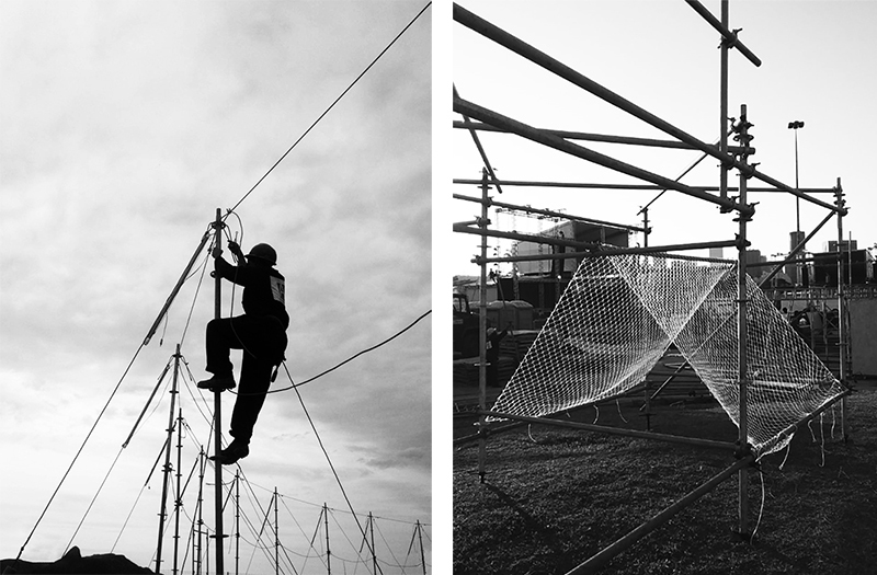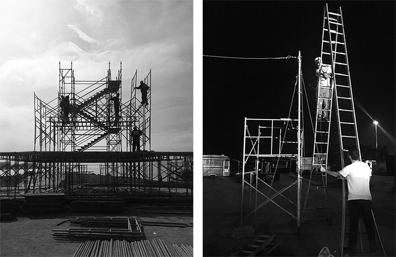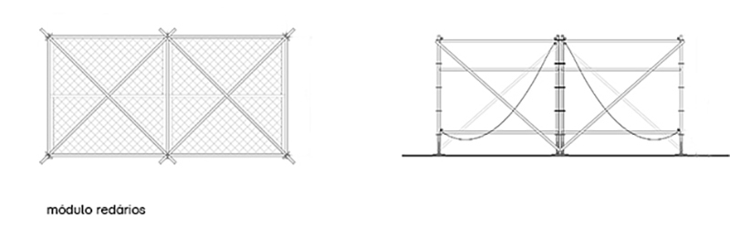o projeto para o queremos! festival compreende o desenvolvimento do plano geral de implantação e o desenho de estruturas especiais para acolher um público aproximado de seis mil pessoas. a proposta buscou oferecer espaços para acomodação confortável do público bem como sublinhar a experiência da paisagem carioca proporcionada pela localização da marina da glória. foram desenvolvidas quatro estruturas especiais para o evento: bar/mirante, redários, picadeiro e o pórtico de entrada do festival. levando em conta o desejo de mitigar o desperdício de materiais e a geração de lixo por parte do projeto, todos os elementos projetados são estruturas desmontáveis e reaproveitáveis, sejam montantes tubulares, pisos e lonas.
