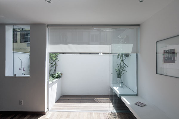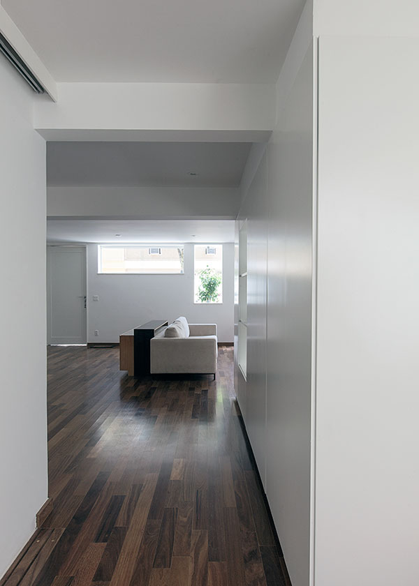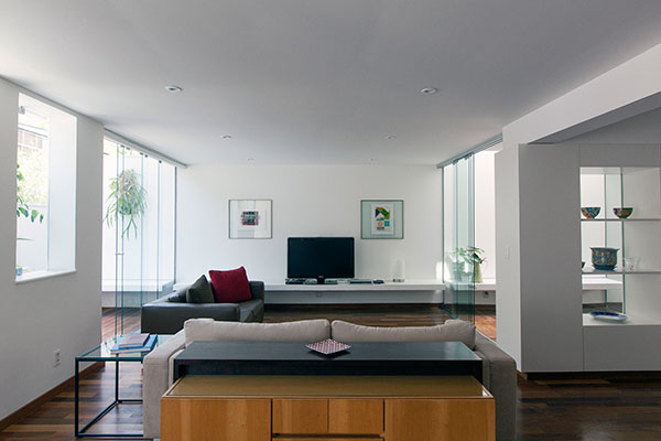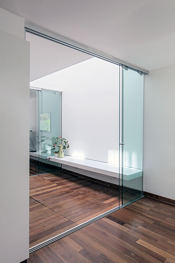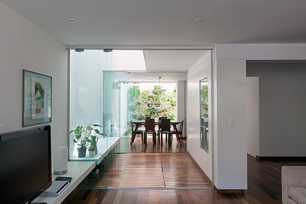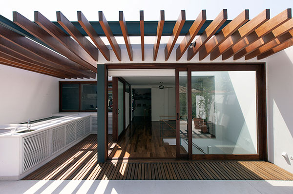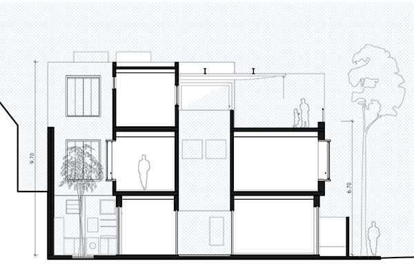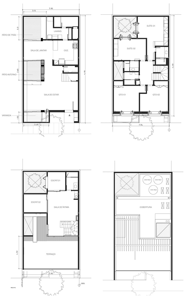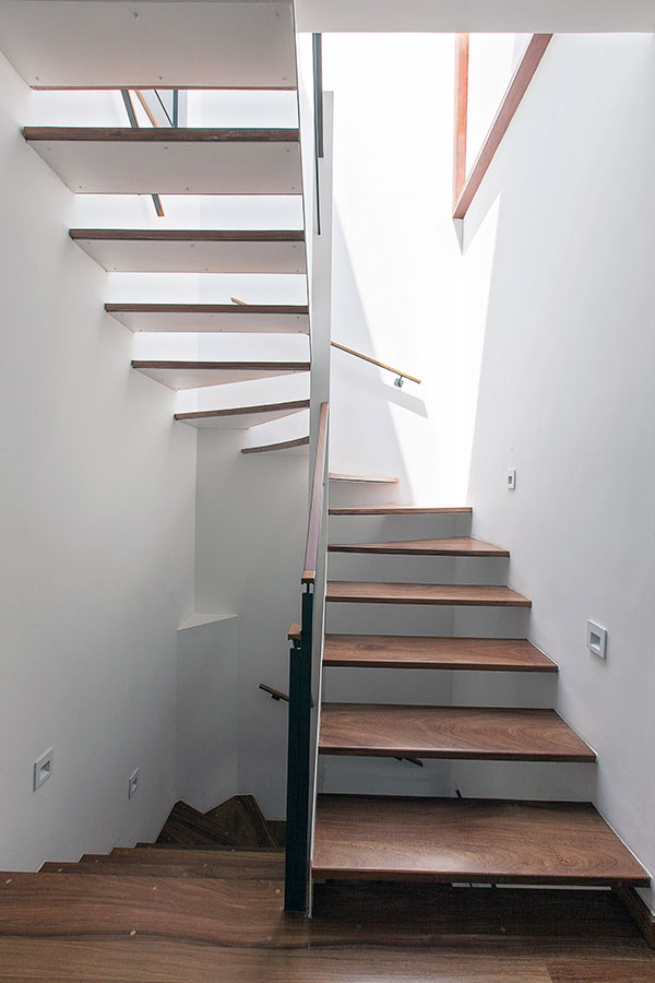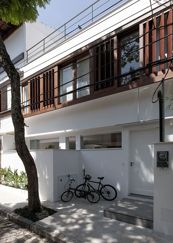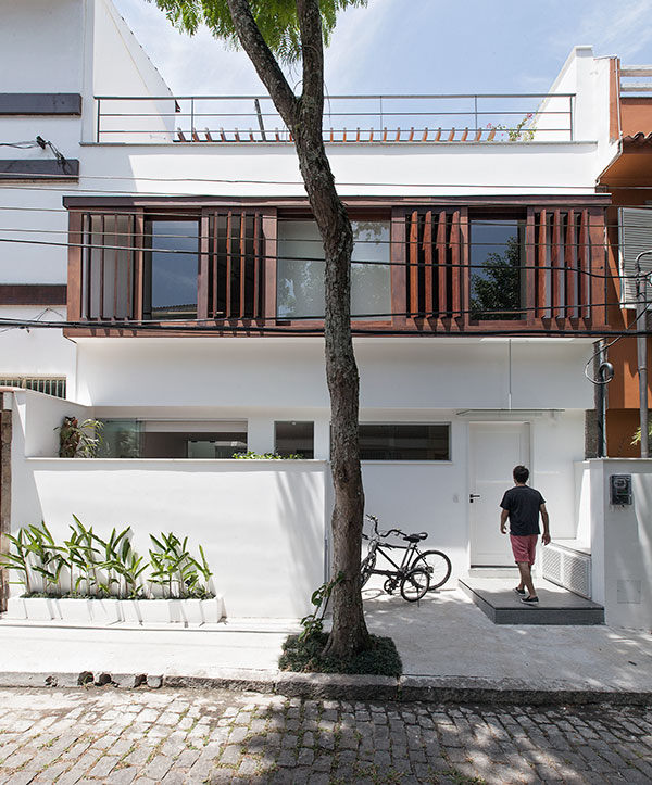 com o desafio de abrigar uma família de cinco pessoas, este projeto consistiu na reforma e ampliação de uma casa de 140m² construída em um condomínio de residências unifamiliares no jardim botânico, rio de janeiro. o lote estreito, profundo e com pouca superfície de contato com o exterior levou à criação de dois pátios internos: um central, para onde abre-se a sala, e um de fundos, que integra um jardim à área de serviço e para onde voltam-se alguns quartos e os escritórios. a escada original é modificada e prolonga-se ao novo pavimento de cobertura, criado para ser um espaço de trabalho e um terraço que tiram partido das vistas e da vegetação local. uma clarabóia ilumina a escada, projetada para trazer luz indireta ao interior e promover a integração entre os pavimentos. as esquadrias propostas para os quartos frontais controlam a entrada de luz e definem a imagem da casa para o exterior.