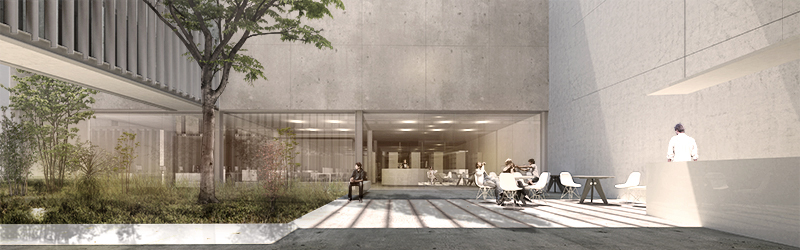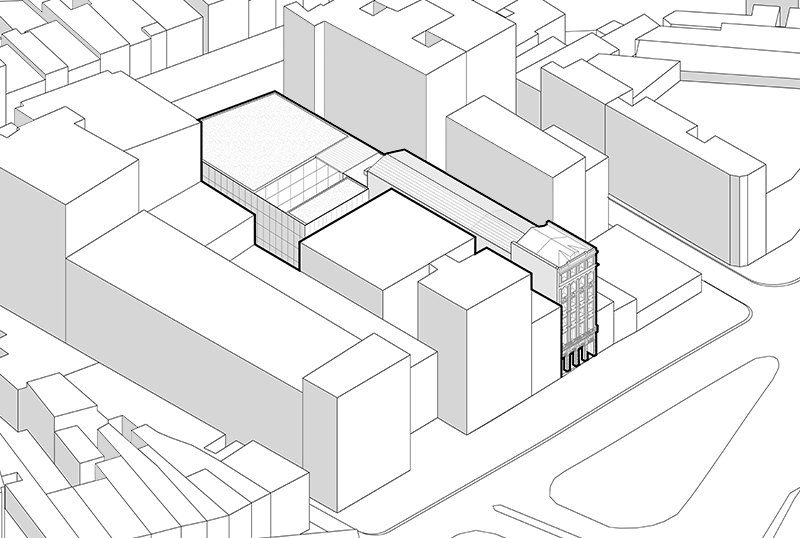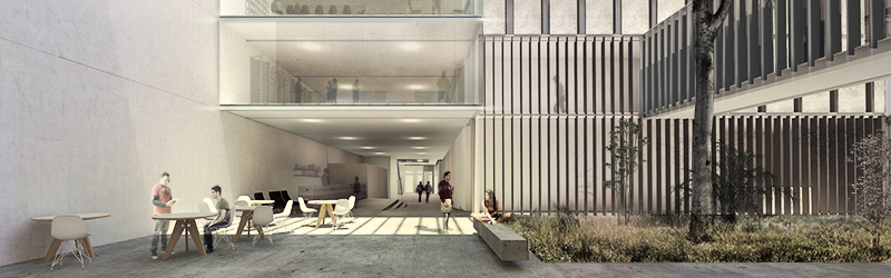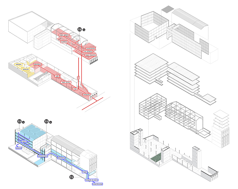 o projeto apresentado no concurso busca agenciar as demandas e necessidades colocadas no edital dentro de um mesmo conjunto edificado de forma integrada, contemplando simultaneamente a criação de um espaço público de referência para o cidade, e a construção de um local apropriado para a guarda do acervo do museu da imagem e do som. a proposta busca articular e recriar os espaços livres do terreno, tornando-os parte do sistema de três edifícios que compõe o conjunto, invertendo a lógica de estruturação de cheios e vazios. Neste caso, o vazio é estruturador do que será ocupado. Na sequência do edifício preservado um átrio coberto estabelece o contato entre este e o novo corpo edificado que se estabelece até o fim do trecho estreito do terreno. Um pátio semi-coberto delimita o volume do acervo, que ocupa o trecho final do lote sobre os espaços da biblioteca e da área de pesquisa.