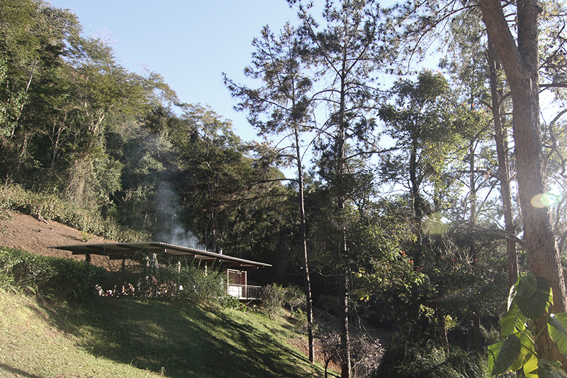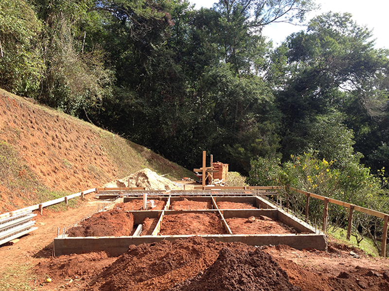 a associação de diferentes sistemas estruturais se dá de maneira a explorar as características de cada um deles: fundações em concreto moldado in-loco, pilares e vigas em madeira maciça, muros em alvenaria estrutural e lajotas em concreto pré-fabricados e ligações em aço.
