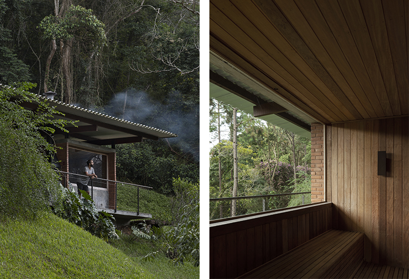o grande plano de cobertura se inclina suavemente em direção ao vale, trazendo para o espaço interior a presença da encosta que se ergue paralelamente à nova construção. abaixo da grande cobertura foram projetados uma cozinha, associada a um espaço para refeições, uma sauna e um espaço de 30m² de área coberta em que o solo vegetal se manteve intacto.