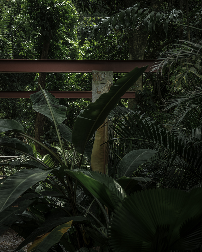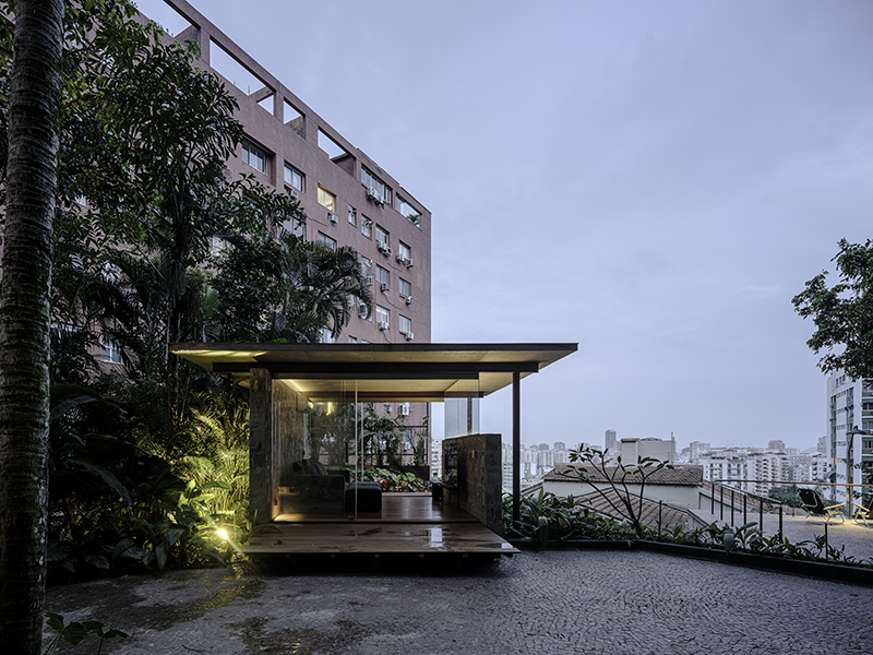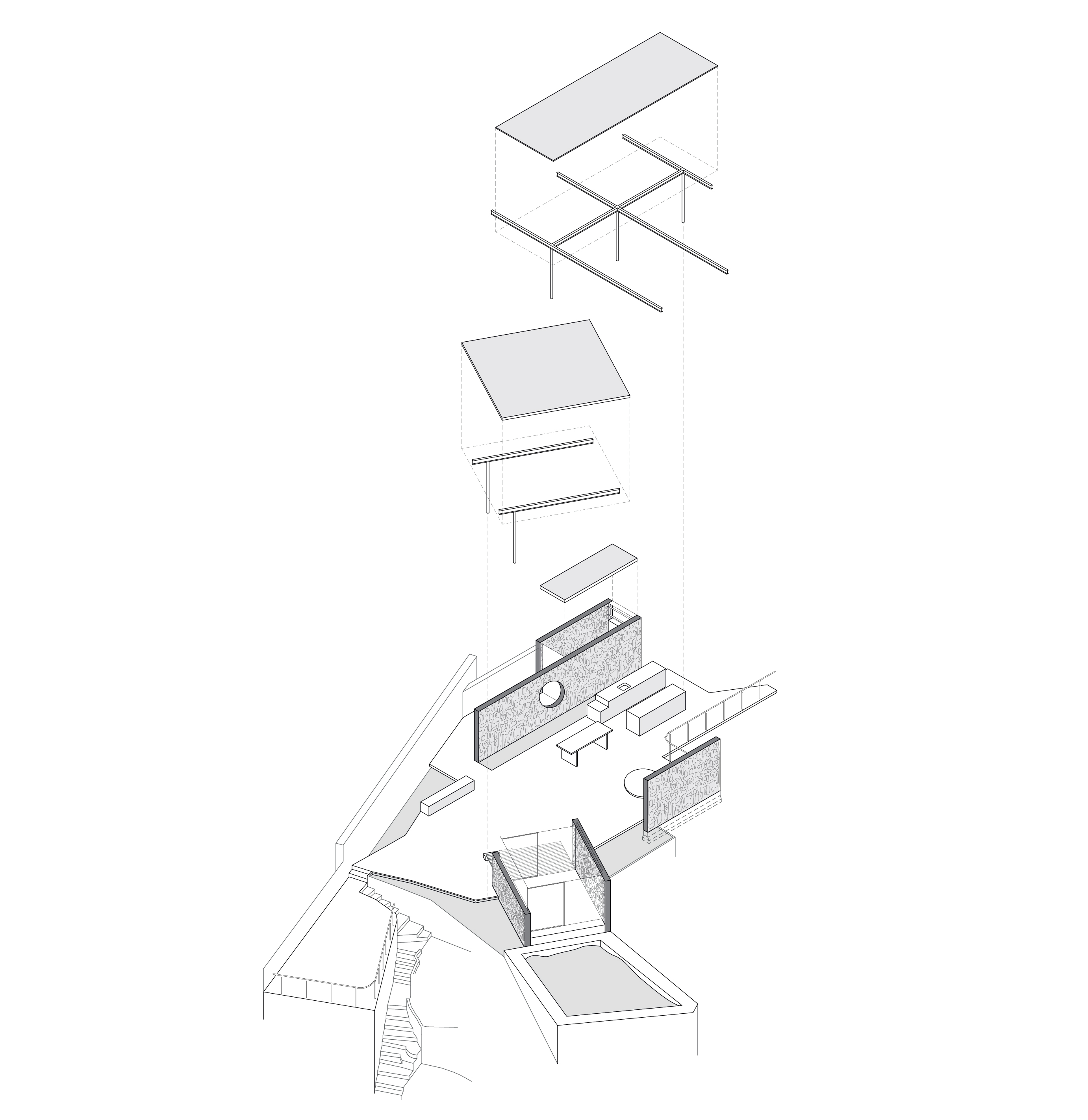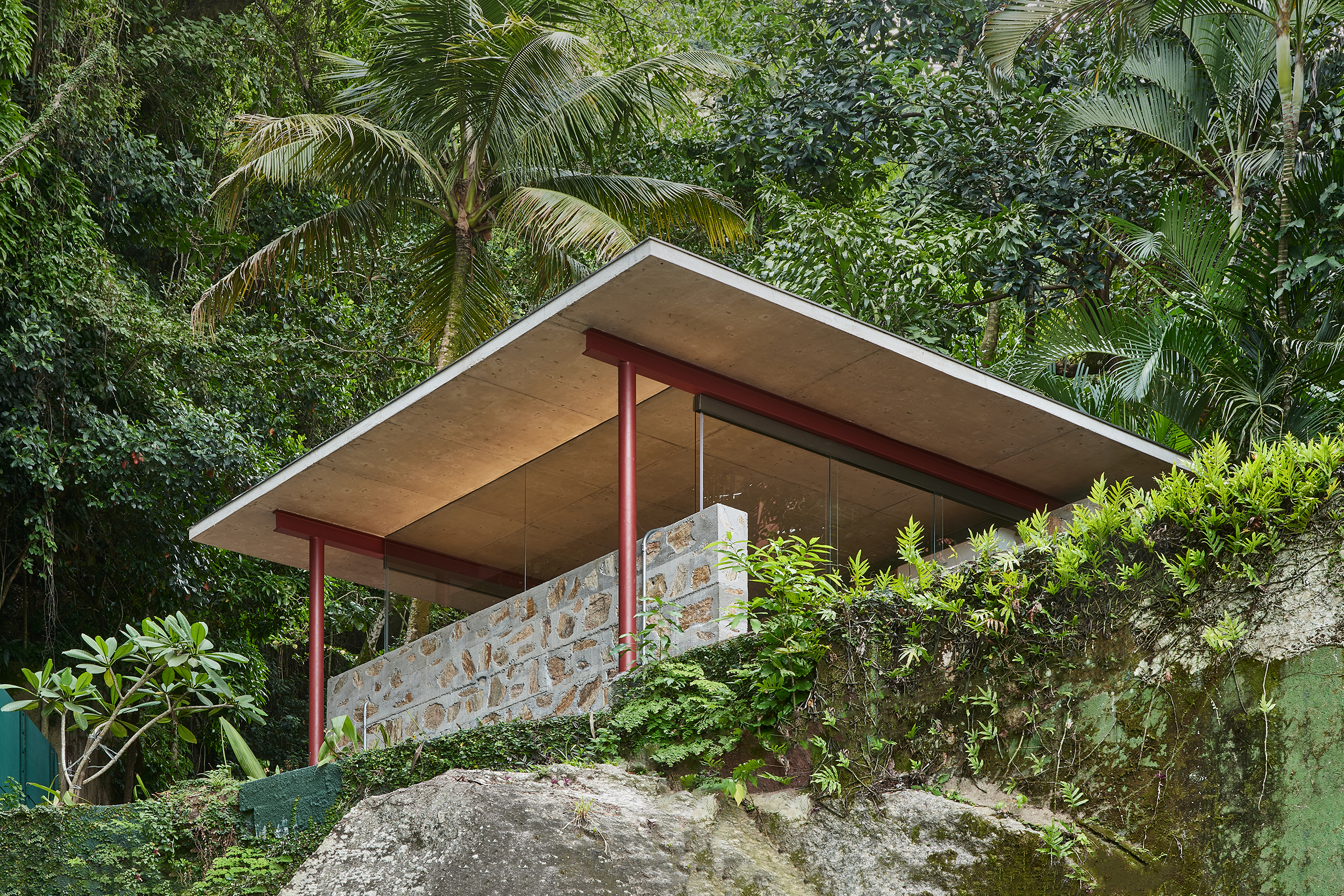este projeto ocupa um platô bordeado por um trecho de mata atlântica, no rio de janeiro. esse pequeno espaço de convívio define-se através da implantação de muros de concreto ciclópico, que organizam áreas de permanência. a ocupação do projeto cumpre a demanda de criar um espaço para cozinhar e comer aberto-coberto, uma pequena sala de estar e uma praça ao ar livre. tomamos emprestado o uso do ciclópico como repertório abundante na cidade do Rio de Janeiro, em especial aqueles que contém cortes nos terrenos por onde passam passeios urbanos em meio a floresta da Tijuca. esbeltas linhas de perfil metálico os conectam e permitem o assentamento de lâminas de concreto que desenham a sombra no espaço, com o auxílio da vegetação local.