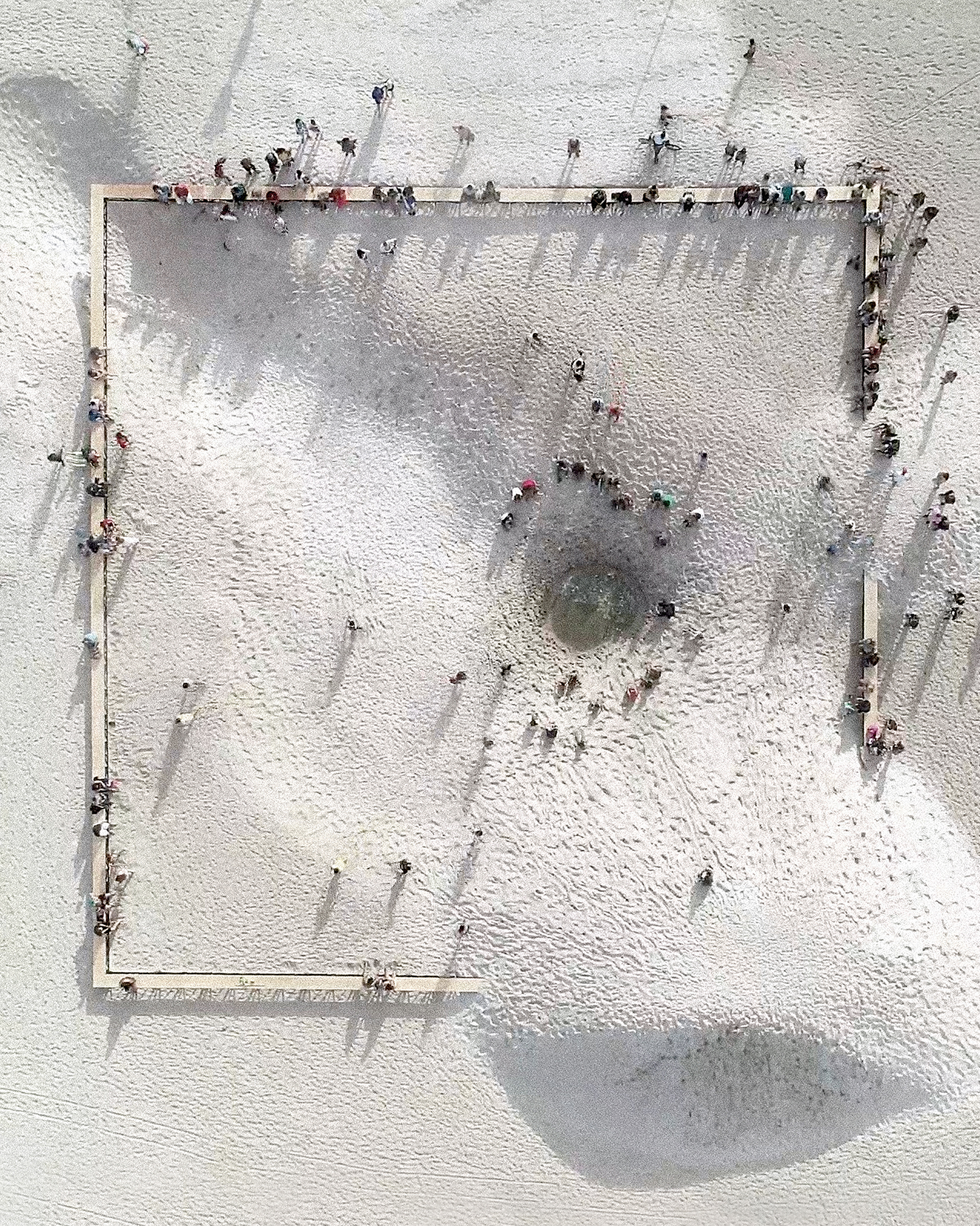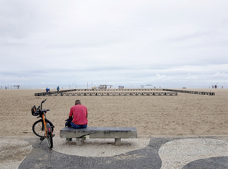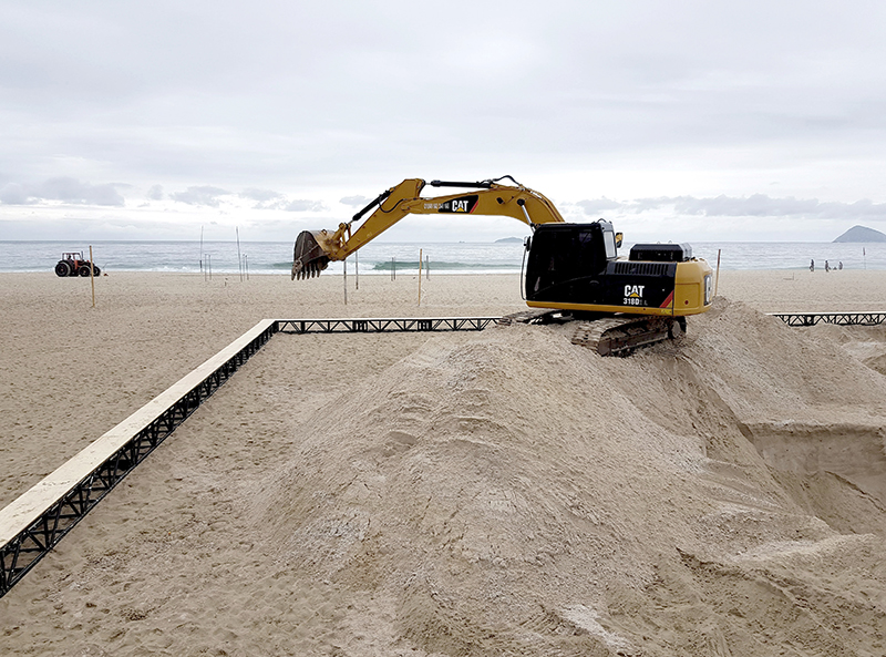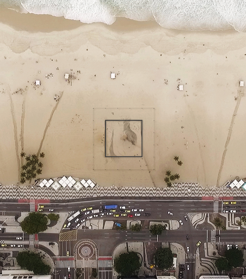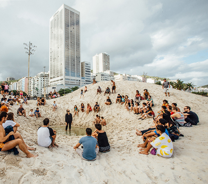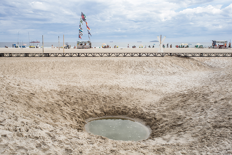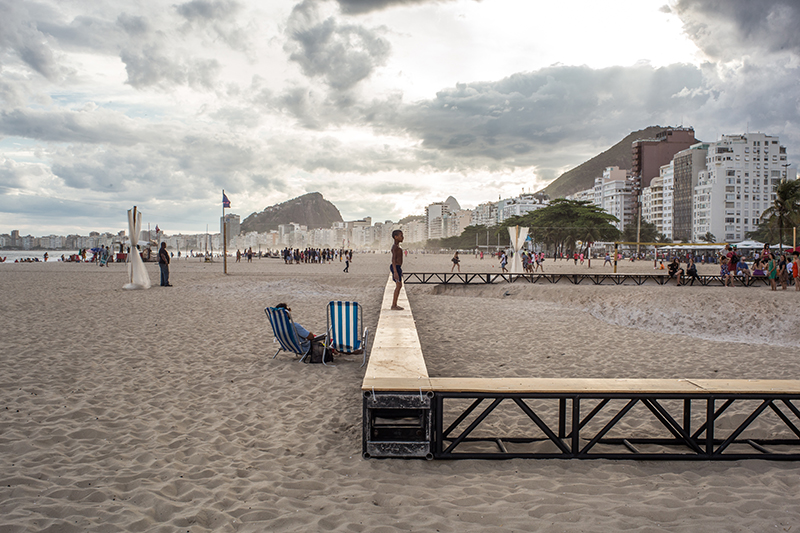 escolhemos a praia de copacabana como sítio a implantar a instalação “a praia e o tempo”. o trabalho se organiza a partir de duas operações combinadas: demarcar e reposicionar. a primeira consiste na inserção de uma grande estrutura quadrilátera de 31x31m e 50 cm de altura que demarca a área de trabalho ao mesmo tempo em que serve como suporte para o acolhimento do público. a segunda se dá a partir do movimento da matéria existente no local – areia e água – que reposicionadas fazem surgir uma nova paisagem topográfica. combinadas, as duas operações geram uma cenário que se transforma gradualmente ao longo do tempo festival, para onde a coreógrafa francesa Julie Desprairies desenhou uma série de performances.
