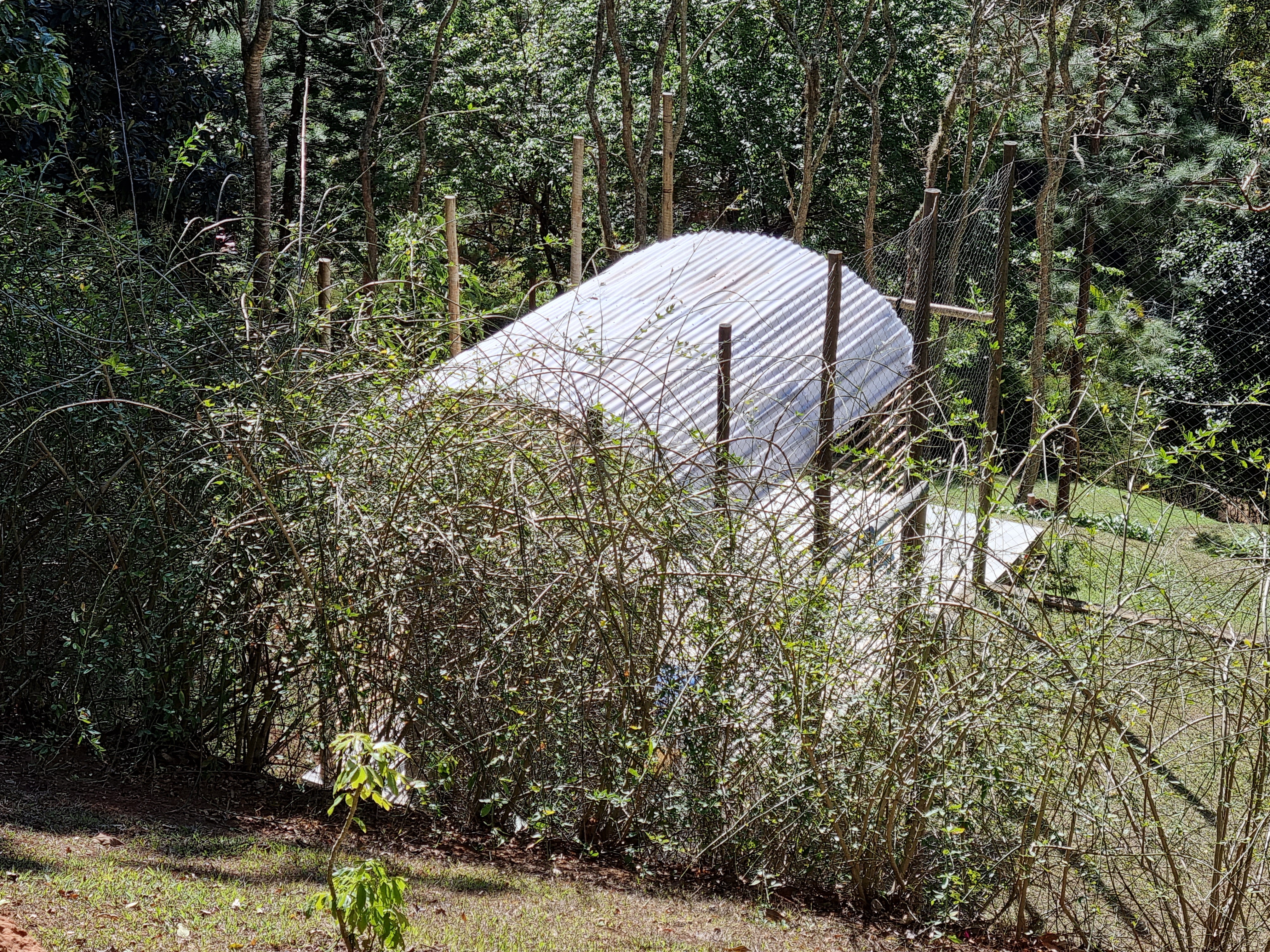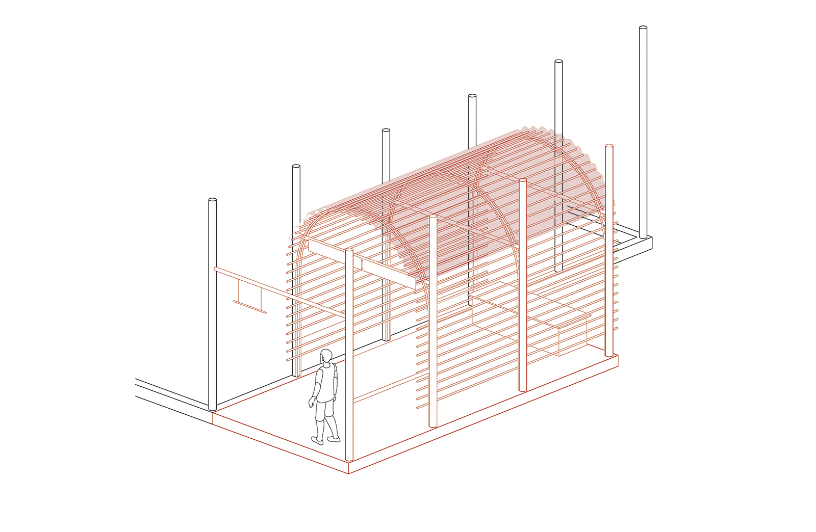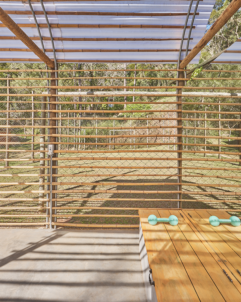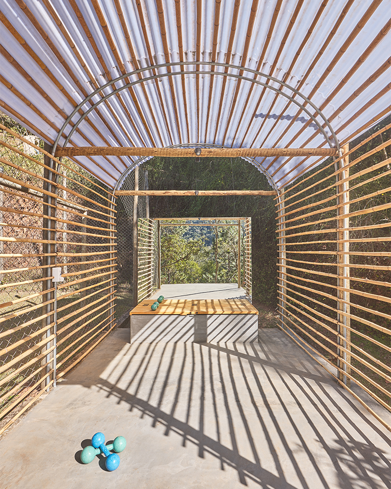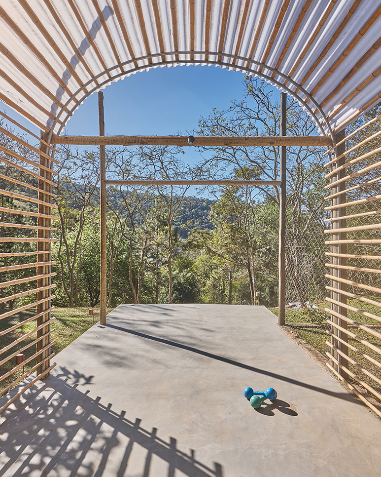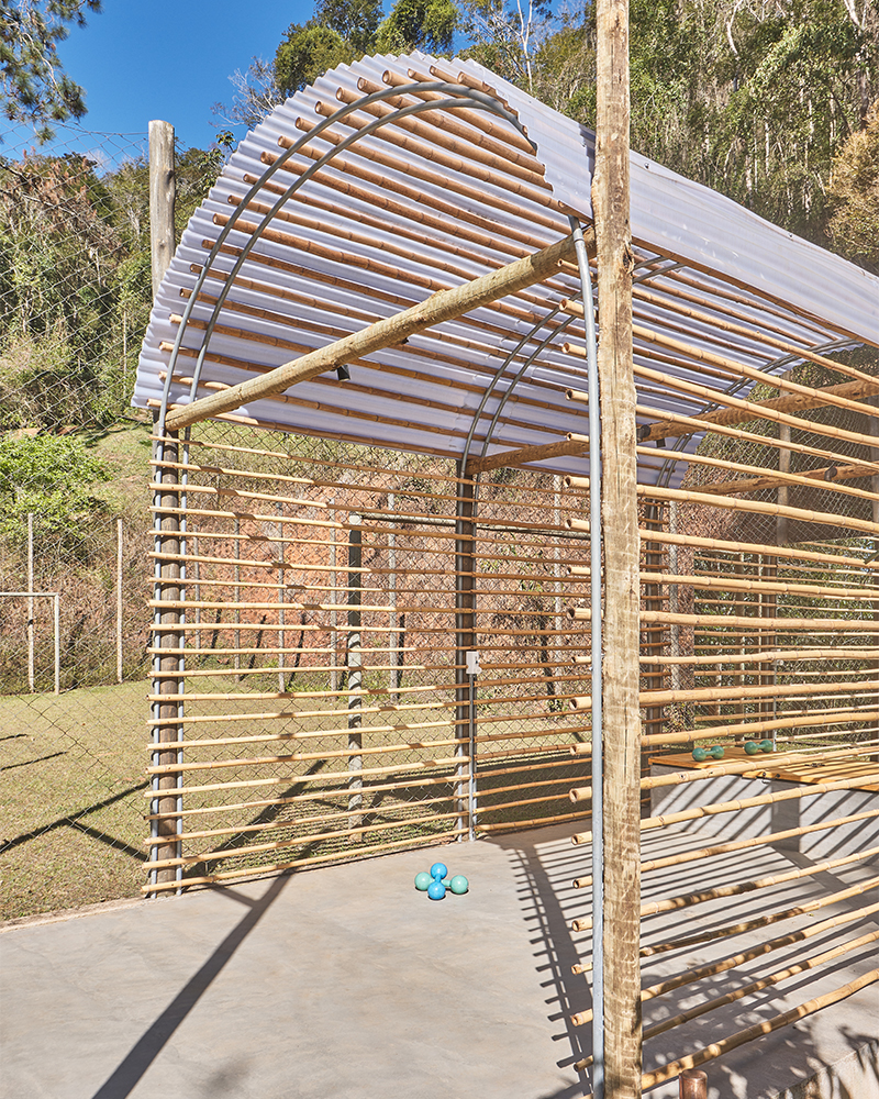 aproveitando uma estrutura em eucalipto pré-existente (que delimita um pequeno campo de futebol) projetamos um simples abrigo em telha de policarbonato, bambu e tubos de aço galvanizado. a cobertura em arco se apoia, de um lado, numa linha dos pilares existentes e, de outro, numa nova, gerando um espaço coberto e aberto.