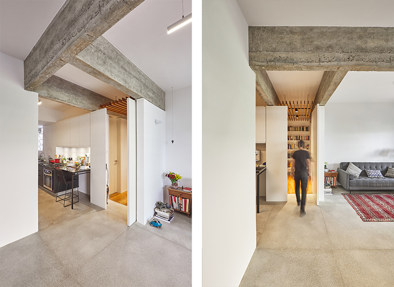 o projeto de reforma deste apartamento teve como objetivo principal promover a integração entre sala, cozinha e área de serviço, trazendo luminosidade para esses últimos espaços. como forma de trazer privacidade aos espaços íntimos foi desenvolvido um painel pivotante que segmenta o corredor de acesso aos dois quartos e ao banheiro principal da sala. este painel estende a materialidade dos armários superiores da cozinha.