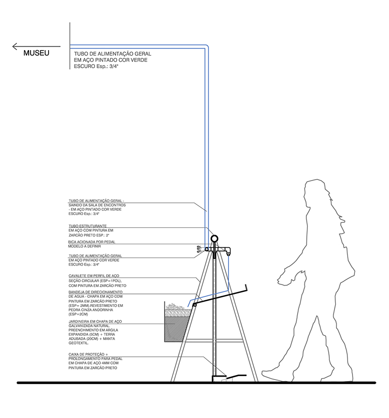 a instalação “bica”, concebida a convite da curadoria da a exposição “casa carioca”, começou a ser projetada em fevereiro de 2020 em meio a uma das mais graves crises hídricas de nossa história e foi concluída em agosto de 2020, durante a pandemia de covid-19. o trabalho cria um novo sub-ramal de distribuição de água do edifício do mar, prolongando-o até a calçada da praça mauá, onde são instaladas 3 bicas públicas. a intervenção na rede de infraestruturas do museu se realiza em três momentos: captação, filtragem e fonte.
