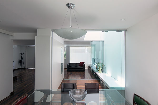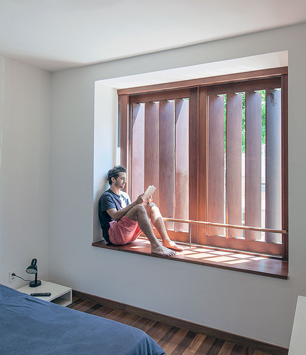 com o desafio de abrigar uma família de cinco pessoas, este projeto consistiu na reforma e ampliação de uma casa de 140m² construída em um condomínio de residências unifamiliares no jardim botânico, rio de janeiro. o lote estreito, profundo e com pouca superfície de contato com o exterior levou à criação de dois pátios internos: um central, para onde abre-se a sala, e um de fundos, que integra um jardim à área de serviço e para onde voltam-se alguns quartos e os escritórios. a escada original é modificada e prolonga-se ao novo pavimento de cobertura, criado para ser um espaço de trabalho e um terraço que tiram partido das vistas e da vegetação local. uma clarabóia ilumina a escada, projetada para trazer luz indireta ao interior e promover a integração entre os pavimentos. as esquadrias propostas para os quartos frontais controlam a entrada de luz e definem a imagem da casa para o exterior.