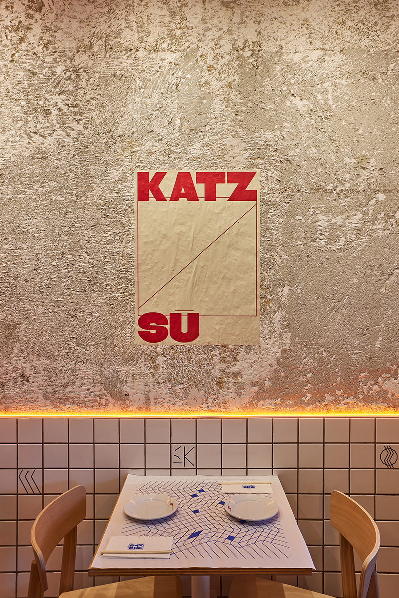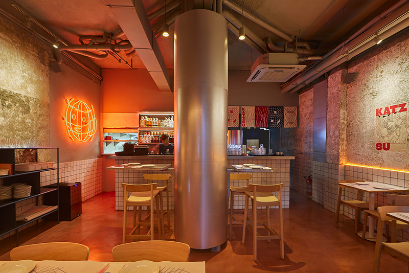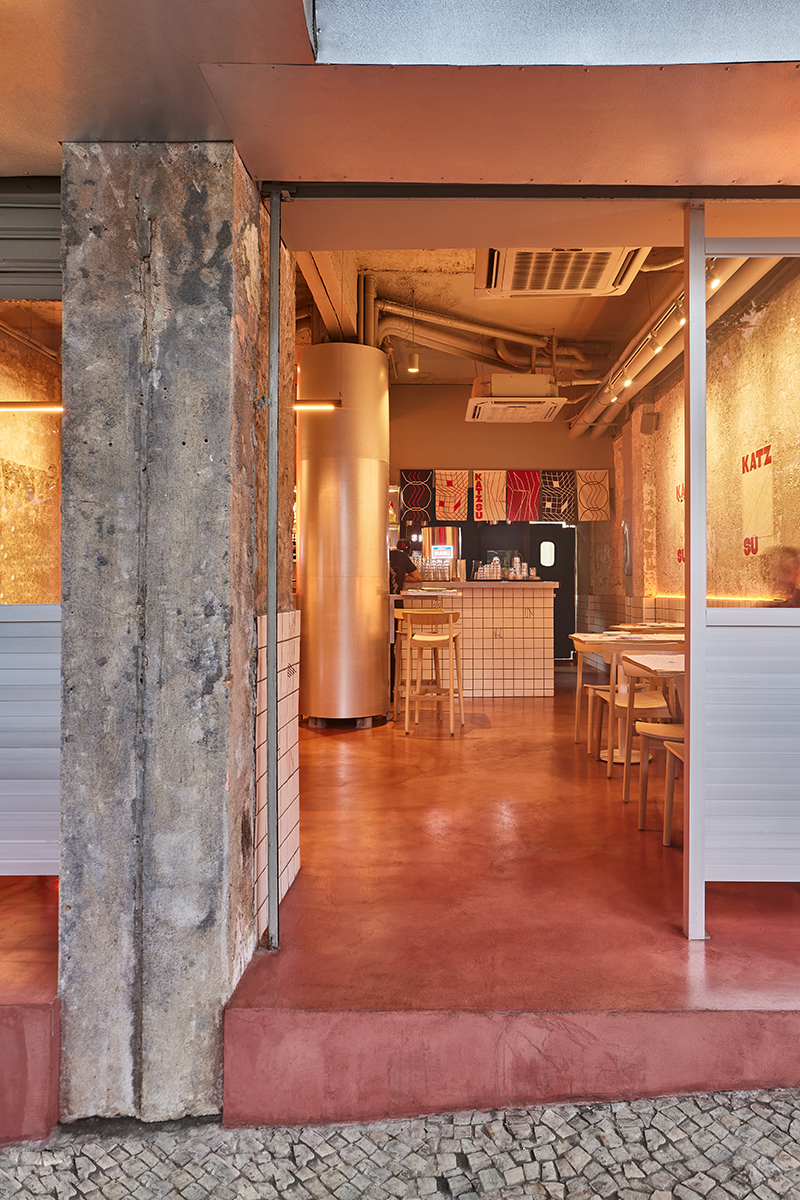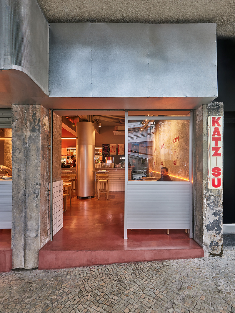 No projeto para a cantina asiática katz-su duas ações definem conceitualmente a ocupação do espaço, resultado do remembramento de três lojas: a criação de um rodameio de azulejos a 1.10m (guia horizontal que amarra todo o ambiente) e a aplicação de um piso monolítico avermelhado. Na mesma cota de meia altura passamos o montante superior das esquadrais de alumínio natural, cuja materialidade remete aos botecos da cidade, mas também as carrocinhas de pipoca, churros, tapiocas, dentre outras várias comidas de rua. Tiramos partido de uma série de instalações prediais localizadas no centro do salão, que não puderam ser desviadas. O elemento circular em metalon + chapa galvanizada simultaneamente organiza a circulação, protege as tubulações e estrutura duas banquetas laterais. Na área frontal a loja, um recinto quadrado definido por dois grandes bancos lineares dá lugar a uma praça externa.