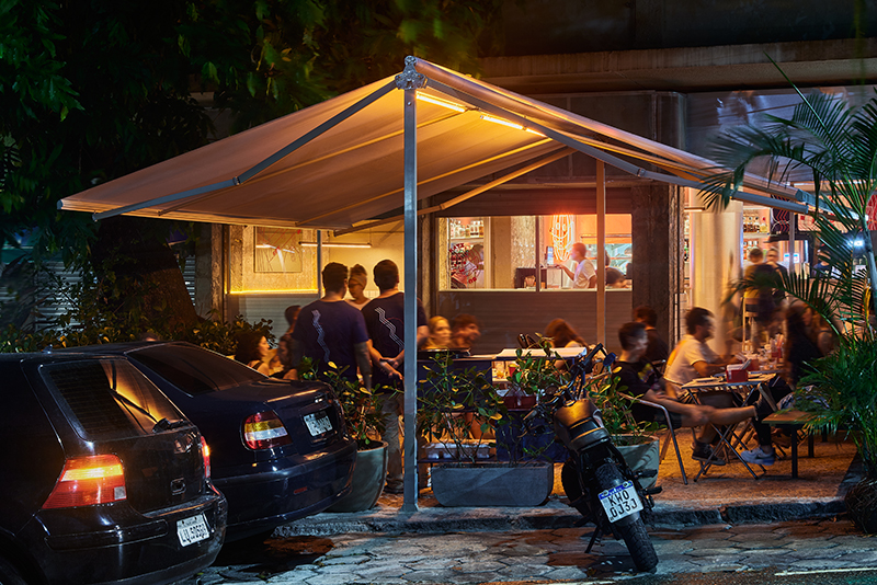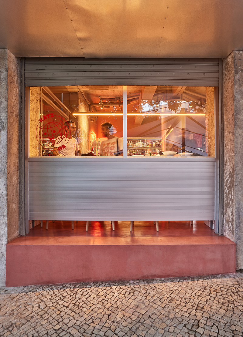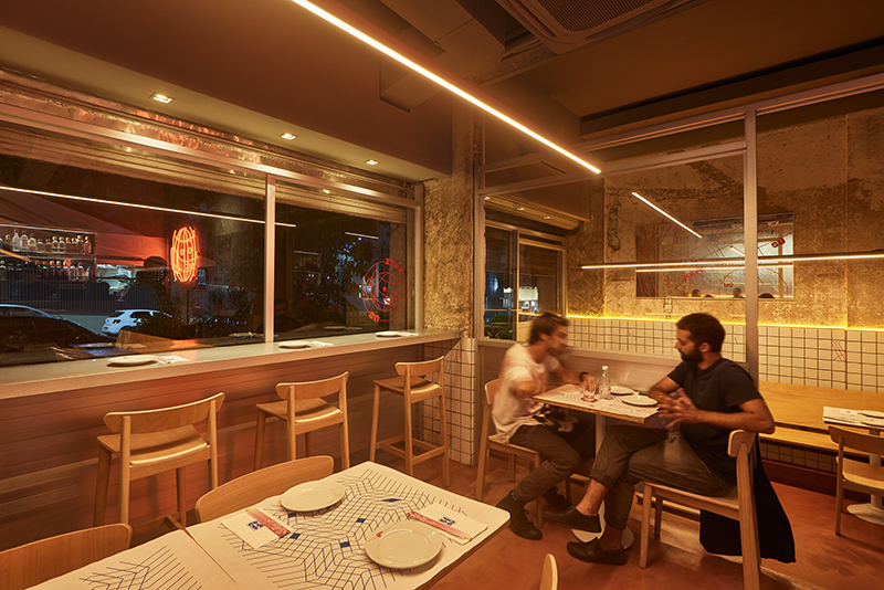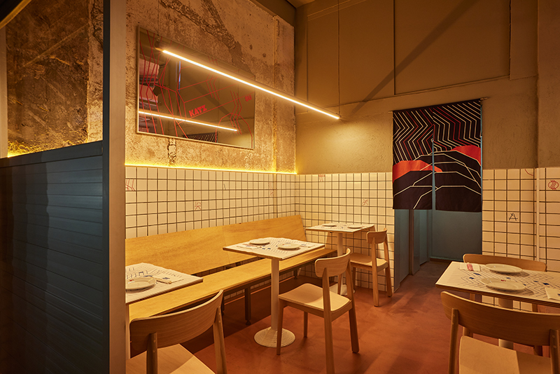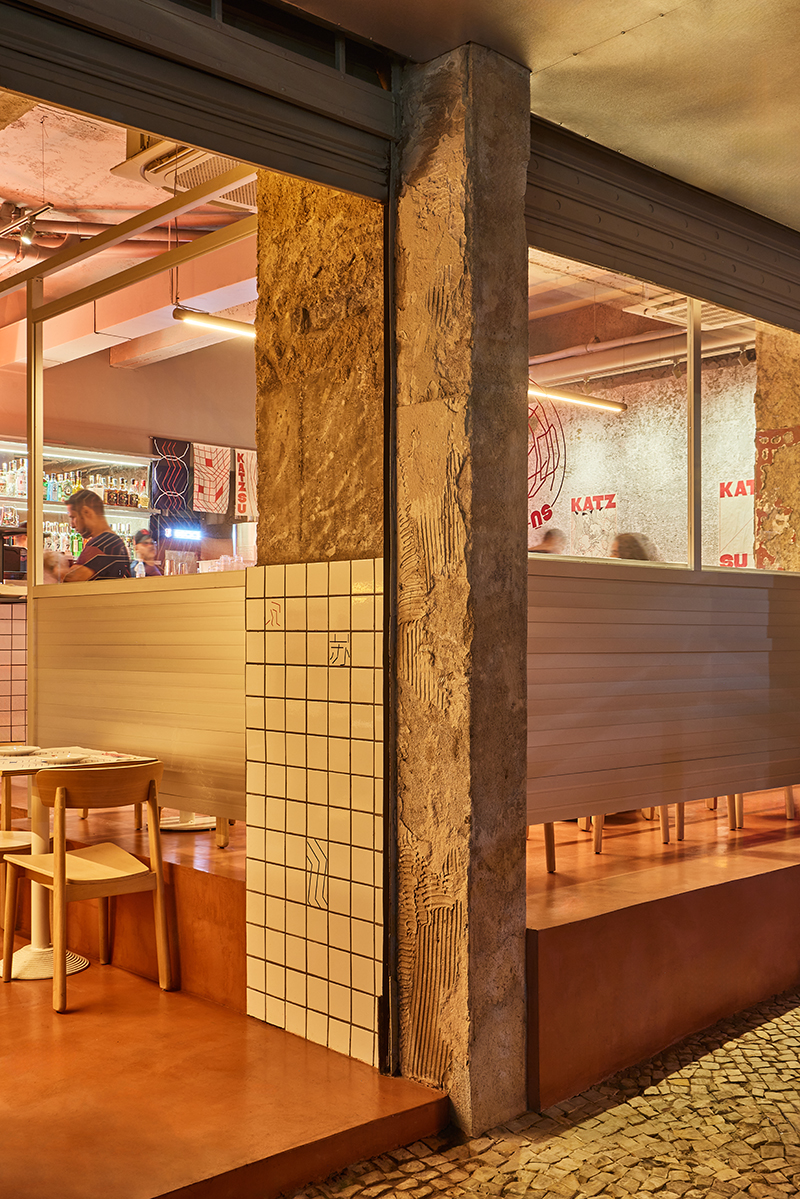 No projeto para a cantina asiática katz-su duas ações definem conceitualmente a ocupação do espaço, resultado do remembramento de três lojas: a criação de um rodameio de azulejos a 1.10m (guia horizontal que amarra todo o ambiente) e a aplicação de um piso monolítico avermelhado. Na mesma cota de meia altura passamos o montante superior das esquadrais de alumínio natural, cuja materialidade remete aos botecos da cidade, mas também as carrocinhas de pipoca, churros, tapiocas, dentre outras várias comidas de rua. Tiramos partido de uma série de instalações prediais localizadas no centro do salão, que não puderam ser desviadas. O elemento circular em metalon + chapa galvanizada simultaneamente organiza a circulação, protege as tubulações e estrutura duas banquetas laterais. Na área frontal a loja, um recinto quadrado definido por dois grandes bancos lineares dá lugar a uma praça externa.